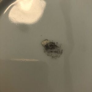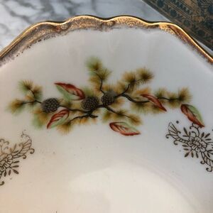 This bowl is in excellent condition. There are no chips or cracks. It has a gold rim and gold accents in the design. The pattern on it is pinecones and leaves. It’s really pretty. There is a mark on the bottom, it it has worn off and I can’t read it. I would say it’s from the 50’s or 60’s. It’s about 7 inches across.