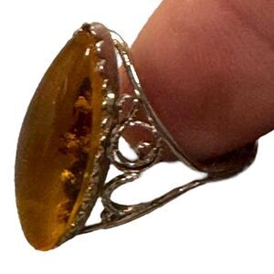 Vintage Statement Natural Baltic Amber Marquise Ring Ornate Silver Filigree Sz6