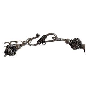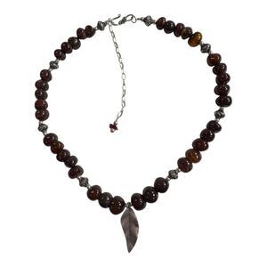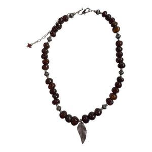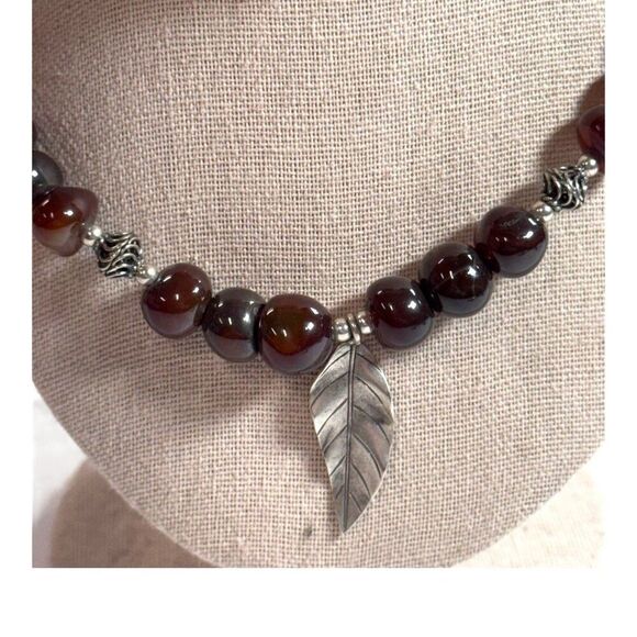 This intricately crafted necklace combines deep brown beads with metallic silver accents, featuring a detailed silver leaf pendant for an elegant statement.
