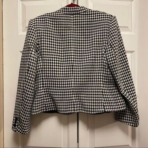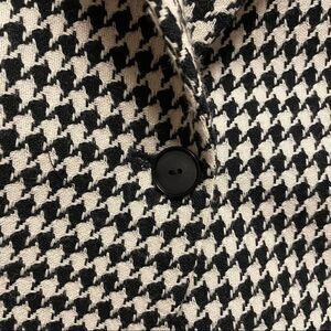 This cropped blazer is in excellent condition. It is patterned with the traditional back and white houndstooth pattern. It is cropped with a one button closure. There is no size tag, but measurements are below. I would say it’s a S/M.