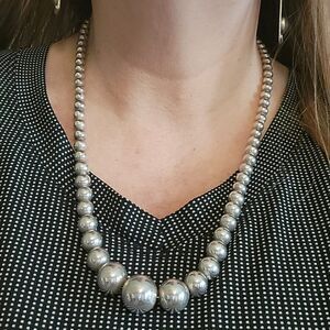 Vintage sterling silver graduated ball bead necklace. Tested and confirmed as sterling silver 925. The piece is well made and is easy to put on over your head. Great piece by itself or layered.