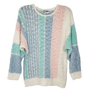 Vintage Striped Popcorn Sweater L Pastel Blue Pink Green Dolman Sleeve Grannie