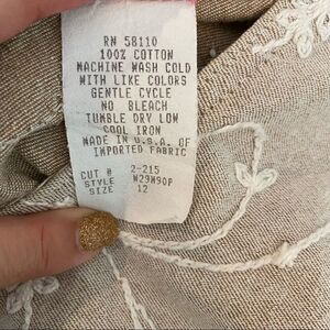 100% cotton is soft and a medium weight. White embroidery in a crewel style with scrolls and leaves. Pretty flower shaped buttons all the way up the back. Great preowned condition- no flaws- very gently worn. Y2K