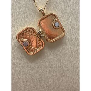 The locket is designed to open, revealing two inner panels with a copper/rose-gold finish, making it perfect for holding small keepsakes or tiny photos. It closes securely using a magnetic mechanism.