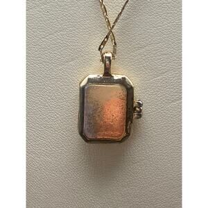 This charming, vintage-style necklace features a two-in-one layered chain design and a distinctive square, hinged locket pendant. The locket has a beautiful, detailed copper-tone/rose-gold-tone face with a subtly engraved diamond pattern, bordered by an intricate gold-tone frame with scalloped details.