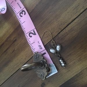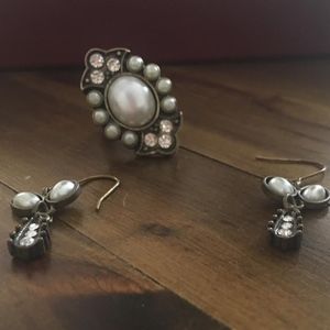 Cute vintage-looking costume earrings and matching ring. Features clear and pearl-like stones. I'm not 100% certain what size the ring is, but I think it's close to a 7.