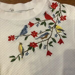 Cozy, naturecore vibes in this soft waffle-knit short sleeve top featuring stunning embroidered birds and florals. With bright red flowers and colorful birds like cardinals, goldfinches, and bluebirds perched on delicate branches, it’s giving garden walk energy. Ribbed hem and cuffs add structure to the relaxed fit.