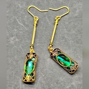 #VintageEarrings #EmeraldJewelry #ArtDecoStyle #StatementEarrings #BohoChic #FiligreeEarrings #RetroGlam #CostumeJewelry #DangleEarrings #PoshFinds