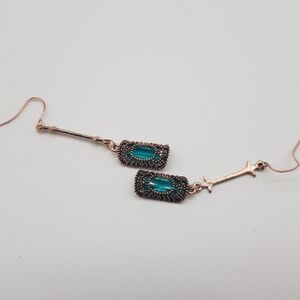 Elevate your accessory game with these elegant vintage-inspired dangle earrings featuring a rich emerald green glass center stone. Set in intricate bronze-tone filigree with delicate Art Deco detailing and elongated bar drops, these earrings bring timeless charm and sophistication to any outfit—from casual chic to evening glam.