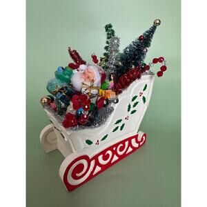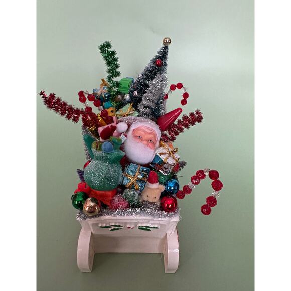 A festive, one-of-a-kind handmade Christmas assemblage, this charming Santa sleigh centerpiece brings together vintage-inspired holiday cheer and nostalgic whimsy. The whiite sleigh ihas classic holly & scroll details and brims with a glittered Santa, bottle-brush trees, mini ornaments, tiny wrapped “gifts,” toy trucks, and cheerful fills — meticulously arranged for a playful yet cozy holiday vignette. Measuring approximately 8″ × 8″, it’s perfect for a mantel, tabletop, or holiday décor shelf. Ideal for collectors of retro holiday pieces or anyone who loves handmade Christmas charm. A delightful hostess gift or seasonal accent that will make a merry statement in your home.
