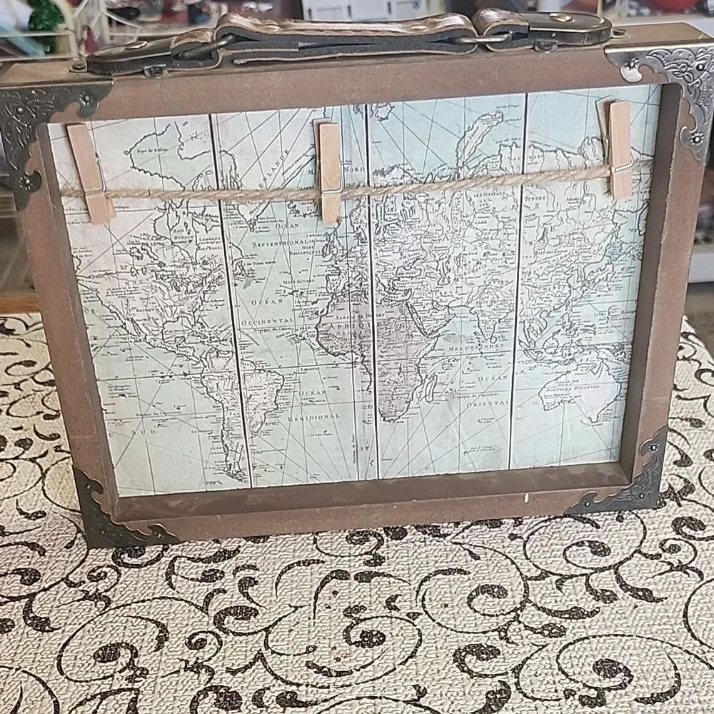 Display your cherished memories with this vintage-style map photo frame. The brown frame adds a classic touch to any decor. It is approximately 7 inches byv9 inches.