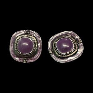 These clip-on earrings combine a vintage-inspired aesthetic with a pop of purple, set against a textured silver-tone frame. A versatile accessory for timeless style.