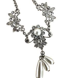 Elegant vintage-inspired necklace with shimmering clear rhinestones and teardrop faux pearl pendants. Crafted for bridal, formal, or evening wear, its ornate filigree front and drop design add a glamorous, timeless touch.