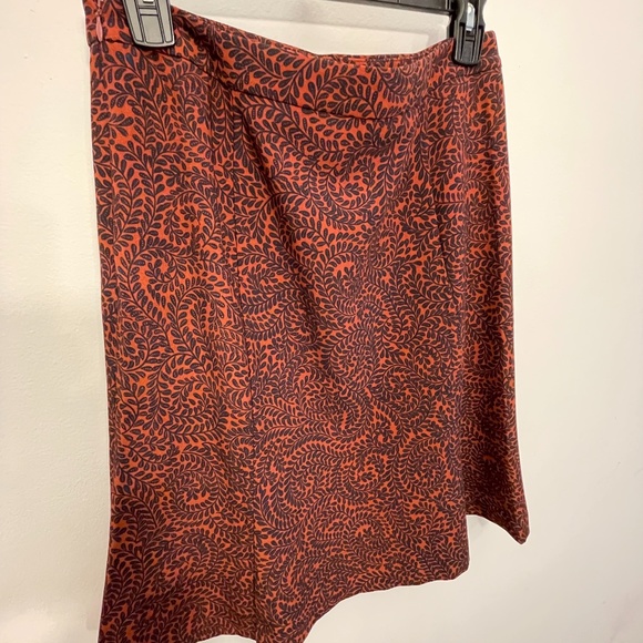 It's a great item for work in the fall and summer seasons with a burnt orange base and navy blue floral pattern. Lightly worn but very loved! It runs true to size and goes to the knee (I am 5'7"). The waist is right above the belly button with a zipper closing on the side.