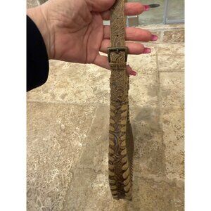 This intricately tooled leather handbag tells a story of craftsmanship and timeless design. With its floral patterns and sturdy whipstitch edges, it evokes a sense of rustic charm. The adjustable strap and spacious interior make it both functional and stylish, a piece that carries tradition with every use.