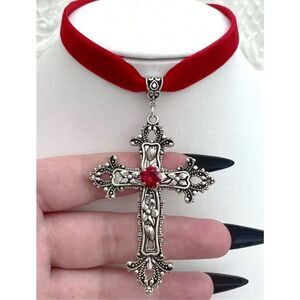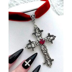 Vintage Style Victorian Regency Goth Red Velvet Cross Pendant Choker Dark Romantic Statement medallion cord chunky chain choker medallion cord