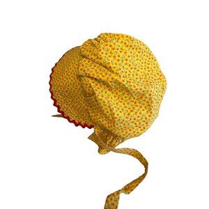 This bonnet is designed for infants, offering a classic look with a yellow floral print and red ric rac trim. The soft fabric ensures comfort and the ties provide a secure fit.