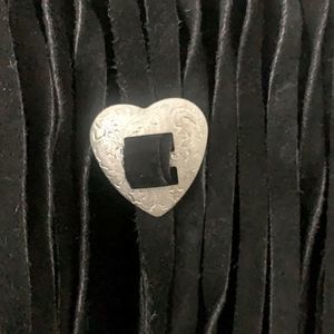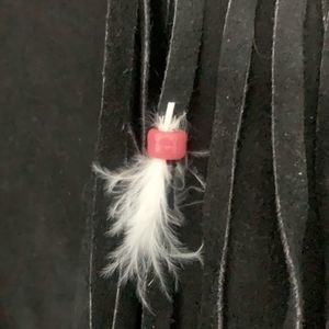 Vintage suede halter top with tassel and feather detailing, and heart hardware.
