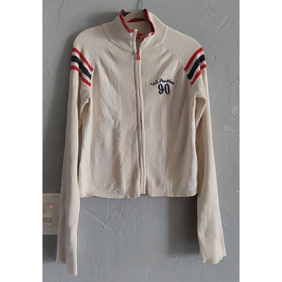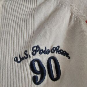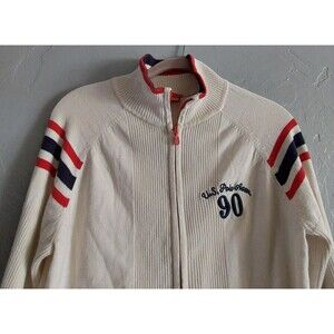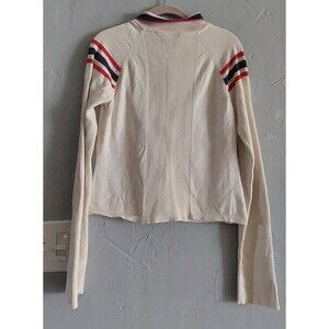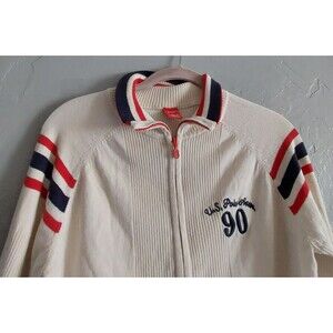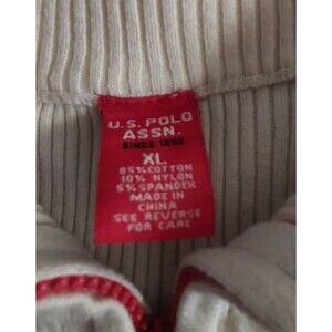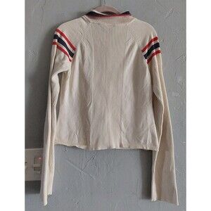 Cropped sweater by U.S. Polo Assn. in cream color. Features a sporty design with full front zipper, high neck, and red and navy stripe details on the shoulders and sleeves. Embroidered with U.S. Polo Assn. 90 on the chest for a retro 90s vibe. Made from a blend of cotton, nylon, and stretch fabric for comfort and a flattering fit. size XL, perfect for a casual modern outfit with a vintage touch.18 inch of Armp To Armp and 20 inch Long.