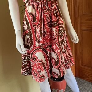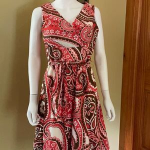 This dress is beautifully made with lots of details. It is the coolest retro pattern out there yet so trendy!!! The matching tie belt is present and the zipper is great! It is a petite size. I am a 6 and it fits me. Please confirm measurements before ordering. Pit to pit 17 1/2” ish, waist 16 1/2” and total length 37”