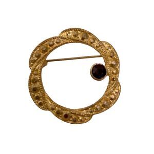 Vintage Textured Gold Tone Scalloped Edge Red Stone Brooch Lapel