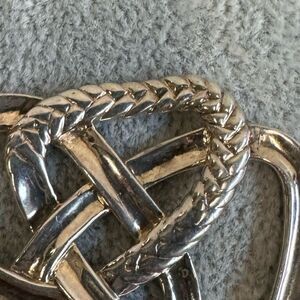 Elegant vintage Tiffany & Co. sterling silver brooch featuring an interwoven love knot motif with polished and braided rope-style detailing.