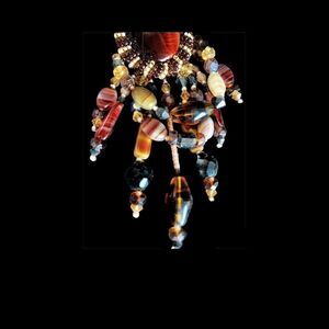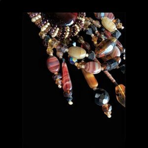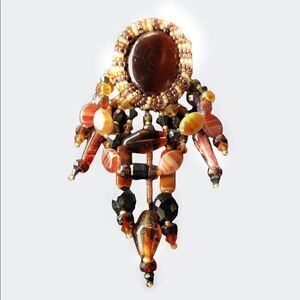 Unique and stunning brooch made by 1980’s jewelry artist Lisa Jo Silberkleit, this amazing brooch has a center large oval tiger eye stone, surrounded with a bezel of brown , pearl and amber glass beads. The dangles are made of banded agate, Czech glass and black Swarovski crystal. Elegant anytime, large runway ready classic design, measures 4” x 2”. Please see all photos for full description.