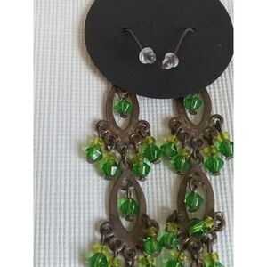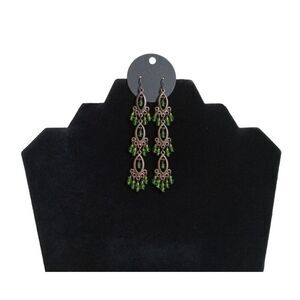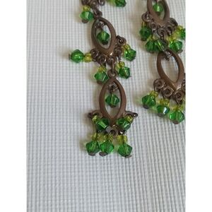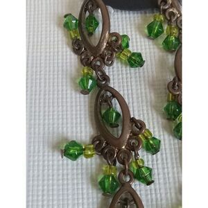 Vintage Translucent Green Beaded & Brassy Toned Metal Dangle Statement Earrings