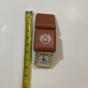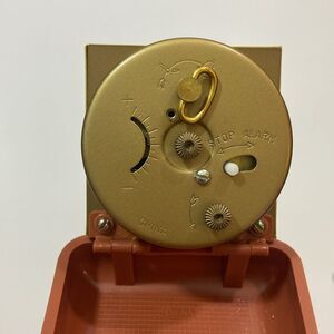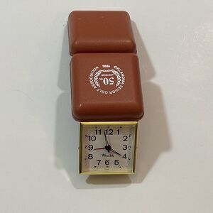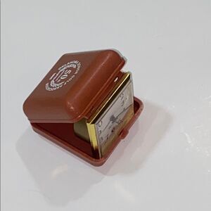 Compact travel alarm clock with a brown case. Features a gold-tone frame and classic design.