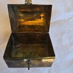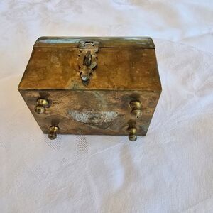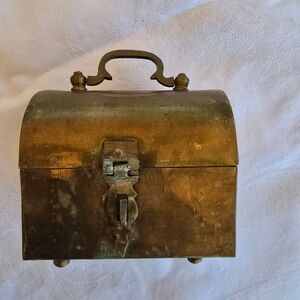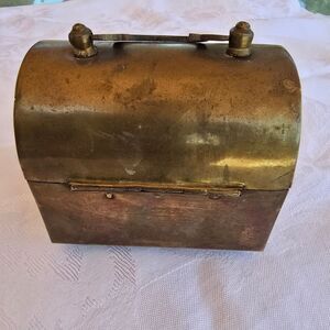 Charming vintage brass box with a sturdy handle. Perfect for decor or storage.