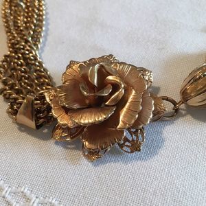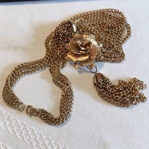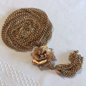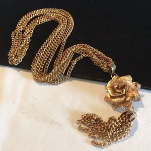 Vintage triple strand gold tone chain linked necklace with flower tassel pendant. In excellent condition. Necklace measures 22 around. Pendant measures 4 inches long from bale to bottom of chain tassel. Flower pendant measures 1 1/4 inches in diameter and almost 1/2 in depth. Necklace has a c-clasp closure.