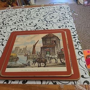 Pre-owned in good used condition. Three cork back trivet with a nautical theme. The smaller one is approximately 8.5 inces by 7.5 inches and is a picture of the Old Hopse Ferry Westminister 1800. The two larger trivet are approximately 10.5 inches by 8.5 inches . one is a picture of Blackfriars Stairs 1700 and the otheris the Tower of London 1750.