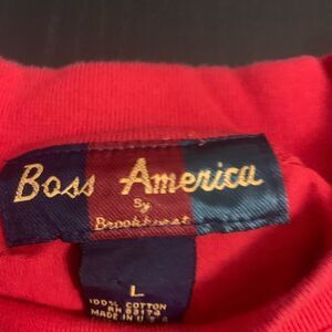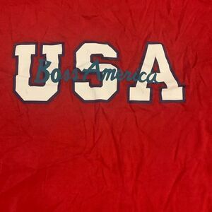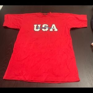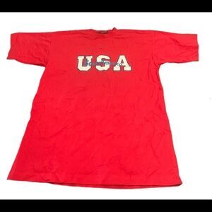 Mens red cotton multicolored graphic vintage USA T-shirt. Excellent vintage condition. Mens size large. Made In the USA!