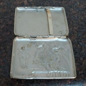 This case is very vintage...please note condition. It is "final Sale". The horse motif is very well done. It will look better in person than photographs. I do not claim to know the metal. It has no marking. A horse lover will want this rare and beautiful item.