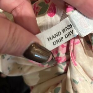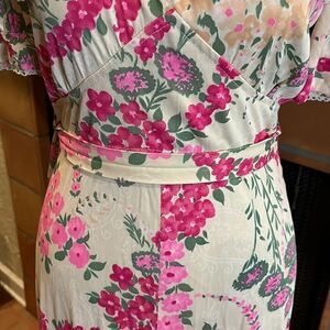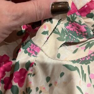 So pretty! Shades of pink against a very pale, peachy tone. Hand sewn! Several loose seams throughout, as shown. Will need a some tlc, and seam mends. Attached tie-waist belt, but one side missing. Again, simple mend, if you sew. A little project, but it’s really beautiful! A little piece of history 😊