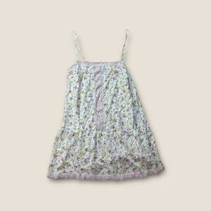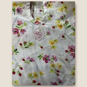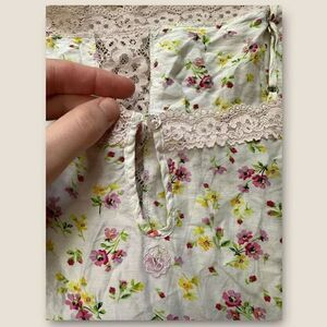 Straight neckline and back … small keyhole opening with button closure on the back ~ Adjustable shoulder straps ~ Sleeveless ~ Curved hemline ~ Lace trims at the neckline, down the front and around the bottom hemline ~ Drop waist silhouette ~ Pullover styling ~ Soft silk blend woven unlined fabric (no stretch) ~ White with a floral print in pink, yellow, purple & green … all lace trims are a solid light pink