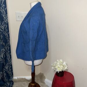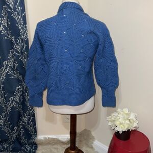 Good, preloved condition. Vintage Homemade Crochet Knit Cardigan Sweater. Blue. Open front. Puff sleeve. Granny core. Cottage Core. Small front pockets.