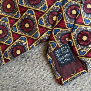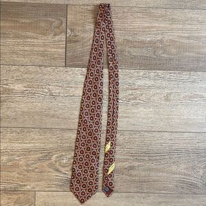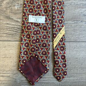 Elevate your style with this elegant patterned men's tie. Featuring a rich blend of red and gold hues mixed in with the classic Valentino logo. In great condition.