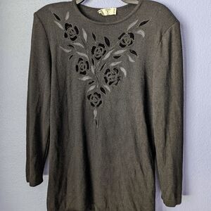 Women's pullover sweater. Made in Italy. 100% wool. Tunic style. Long sleeve with velvet buttons on cuff. Round neck with floral rose pattern. Great condition.