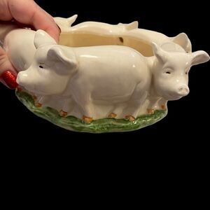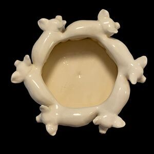 This adorable vintage planter is in excellent condition. The only even minor flaw is a small chip on one of the pig's ears (see pic). The pigs are in a circle and look to be hand painted. The planter is approximately 9 1/2" across and 3 1/2" high.