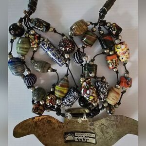 This one of a kind piece, handmade in India can be worn as a belt or necklace if a clasp is added. Also works beautifully as wall art. Some wear as shown. Features an approximately 43" long strap and brass medallion, beads of all beautiful colors and these photos simply cannot do it justice!