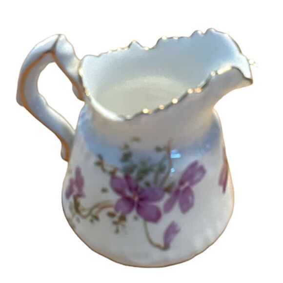 Cream and sugar set is in great shape despite tittle chip on creamer mouth. Gold-plated, made in England. Measurements: Creamer 3.5” X 3” Sugar holder: 1.5” X 2.5”.