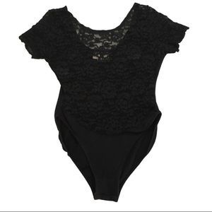 Vintage Victoria's Secret gold label black lace and sheer front (solid back) leotard bodysuit. In excellent preowned condition. Size Small. Sexy!