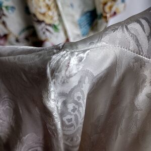 vintage, made in Sri Lanka, gold label pajama set, satin. the elastic in the pants does not have much stretch left and could benefit from being replaced. There is a small tear in the crotch and has a black mark near the waist, see pictures. top pit to pit 26" length 30". pants waist 21" length 29"