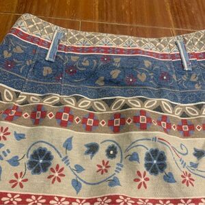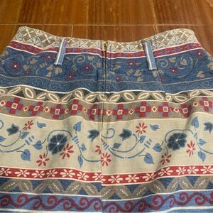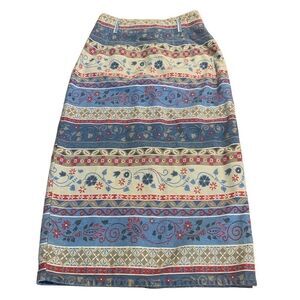 Vintage Vivaldi Jeanswear Artsy Aztec Floral Boho Geometric Denim Maxi Skirt 8. Zipper closure. Belt loops. Great preowned vintage condition. Approximate measurements waist length flat 28 inches hips. 39 inches length 33 inches. Made in the USA.