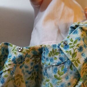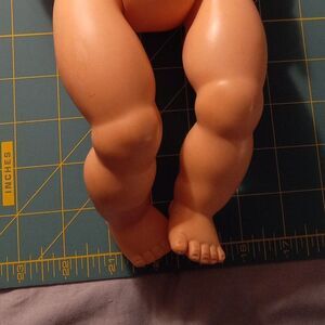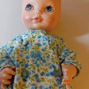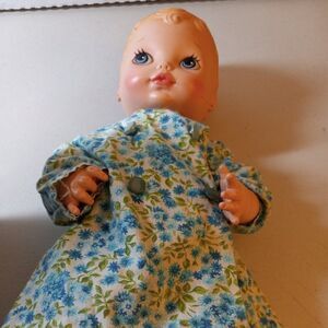 15 inches long, dressed in white slip with Velcro fastener, dress with metal snaps