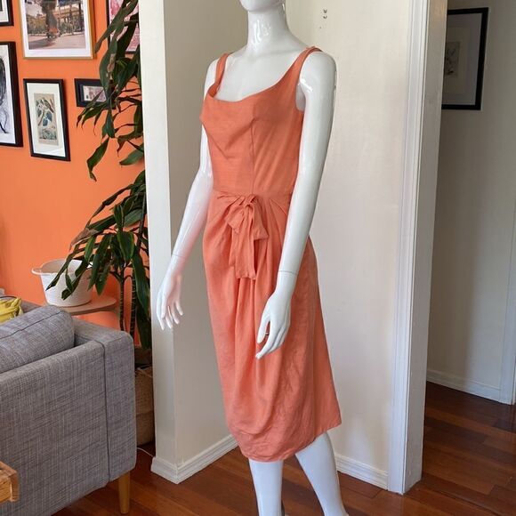 This dress does not have a materials or size tag, but it fits like a modern day small and the material is very structured without any stretch so please pay attention to the provided measurements in the photos. Colors may vary depending on lighting and device used to view item. This dress is a coral/ peach color. Purchasing this item acknowledges that you have viewed all pictures, read entire description, and asked questions if applicable prior to purchase.