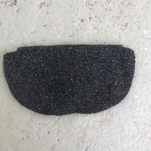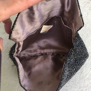 Hand beaded in Belgium for Wallburg. Inside label is coming unstitched. Please look at the pictures I show on the front left. The beading has a little white spot at the most probably be cleaned. Measures approximately 8 x 4. Black beading has a little bit of an iridescent lock