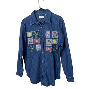 Vintage Westbound 90s Christmas Patchwork Embroidery Denim Shirt Large‎