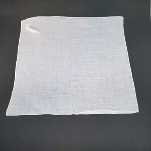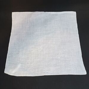 Vintage white handkerchief with a pink and white crocheted flower attached to one corner. Size: 10.5" x 10"